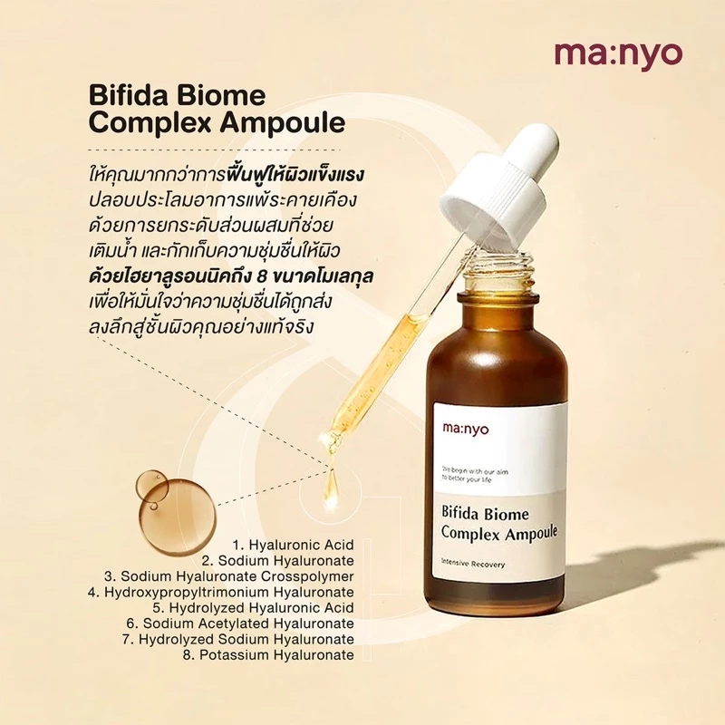 Manyo Bifida Biome Complex Ampoule อัดแน่นด้วยส่วนผสมจาก Bifida Biome (Bifida Ferment Lysate, Bifida Ferment Filtrate ที่ใส่มาถึง 72% ) และ 5 Probiotics สูตรเฉพาะของ มานโย ช่วยเสริมสร้างปราการผิวให้แข็งแรงและสมดุล กระตุ้นให้เกิดการฟื้นฟูผิว เหมาะสำหรับผิวที่ระคายเคืองแพ้ง่าย และยังอุดมไปด้วยส่วนผสมที่ช่วยให้ผิวดูกระจ่างใส ริ้วรอยบางๆดูจางลง เติมความชุ่มชื่นให้ผิวอย่างเข้มข้น
