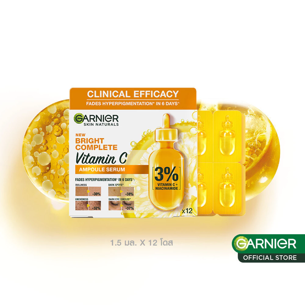 Garnier Bright Complete Vitamin C Ampoule Serum ออกแบบมาเพื่อบำรุงผิวหน้าให้กระจ่างใสและลดเลือนจุดด่างดำ ด้วยสารสำคัญคือ วิตามินซี ที่มีคุณสมบัติช่วยปรับสีผิวให้ดูสว่างขึ้น และช่วยลดการเกิดจุดด่างดำจากแสงแดดและมลภาวะ เซรั่มมีเนื้อบางเบา ซึมซาบเร็ว ไม่เหนียวเหนอะหนะ ทำให้สามารถใช้ได้ทุกวัน