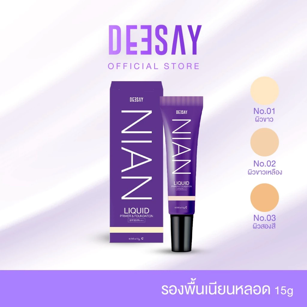 DEESAY Nian Liquid Primer & Foundation เป็นผลิตภัณฑ์รองพื้นที่รวมคุณสมบัติของไพรเมอร์และรองพื้นไว้ในหนึ่งเดียว เพื่อให้การแต่งหน้าดูเรียบเนียนและติดทนนาน โดยมี SPF30 PA+++ ช่วยปกป้องผิวจากรังสี UV และแสงแดด รองพื้นนี้มีเนื้อสัมผัสเบาและบางใส ซึ่งช่วยให้ผิวหน้าดูสดใสและเป็นธรรมชาติ มีคุณสมบัติในการปกปิดรูขุมขนและจุดบกพร่องได้อย่างมีประสิทธิภาพ นอกจากนี้ยังช่วยควบคุมความมัน ทำให้เหมาะสำหรับการใช้งานในชีวิตประจำวัน โดยไม่ทำให้รู้สึกหนักหน้า การใช้ DEESAY Nian Liquid Primer & Foundation จะช่วยให้คุณได้ลุคที่ดูสวยงามและมั่นใจตลอดทั้งวัน
