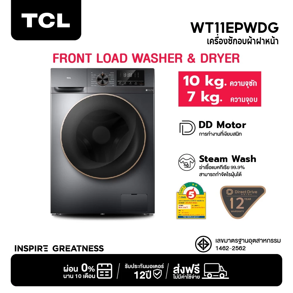 - TCL Wash & Dry เครื่องซักผ้าฝ้าหน้าสีเทาเข้ม รุ่น WT11EPWDG มอเตอร์ Inverter Direct Drive ประหยัดไฟ