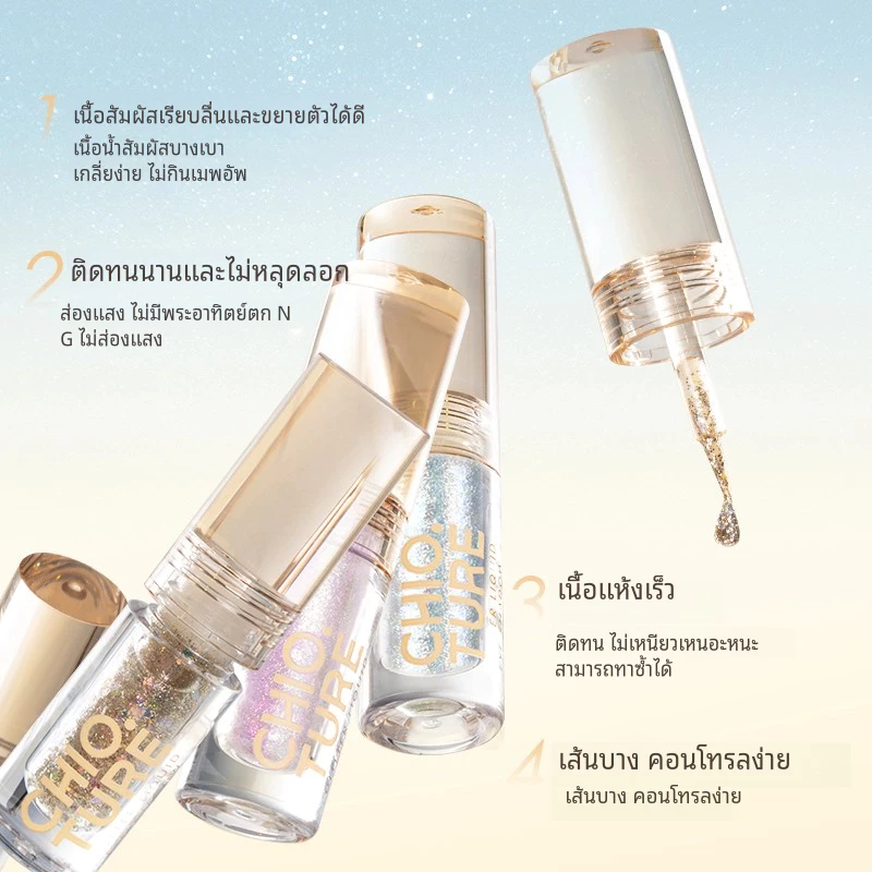 อายแชโดว์กลิตเตอร์ในรูปแบบลิคควิดจากแบรนด์ Chioture ที่มีคุณสมบัติกันน้ำและกันเหงื่อ ซึ่งช่วยให้การแต่งตาดูสวยเปล่งประกายตลอดวันโดยไม่ต้องกังวลเรื่องสีหลุดลอกหรือเลอะเลือน เนื้อสัมผัสเบาบาง เกลี่ยง่ายและแห้งเร็ว พร้อมกลิตเตอร์ที่ช่วยเพิ่มมิติและความโดดเด่นให้กับดวงตา