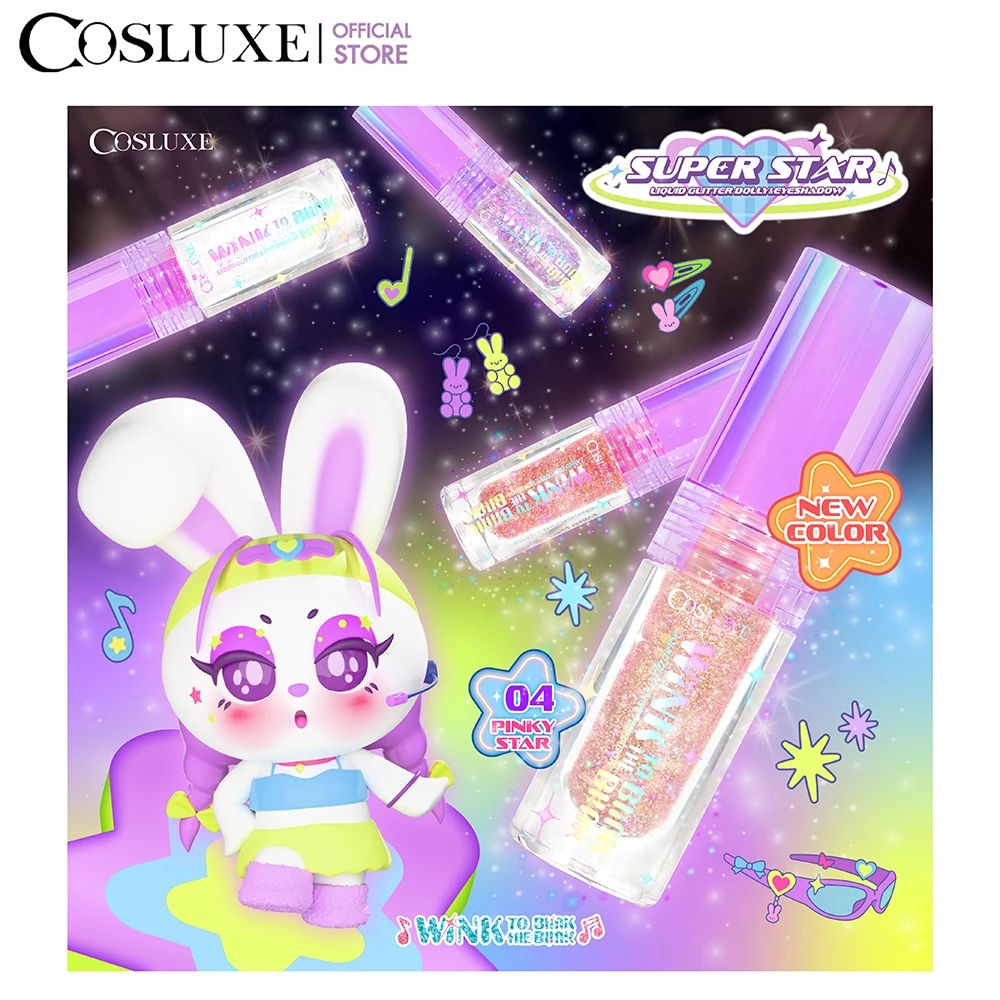 คอลเล็คชั่นกลิตเตอร์น้องกระต่ายจากคอสลุกส์ แนะนำน้องคนใหม่ “คอสลุกส์ ซุปเปอร์สตาร์ส” ลิขวิด กลิตเตอร์ ดอลลี่ แอนด์ อายแชโดว์ ด้วยความละเอียดของเม็ดกลิตเตอร์ที่จะปกคลุมเปลือกตาของคุณให้ระยิบระยับประกายแสงมากกว่าเคย โดยไม่ทำให้ตกร่อง เนื้อเกลี่ยง่าย สามารถเป็นทั้งอายแชโดว์บริเวณเปลือกตา และดอลลี่อาย เพิ่มความคิวท์ที่ขอบตาเพื่อความกลมโตและมีเสน่ห์มากขึ้น ใช้งานได้หลากหลาย ติดทนนานและโกลว์วิ๊งและบลิ๊งทั้งวันไม่ลบเลือน