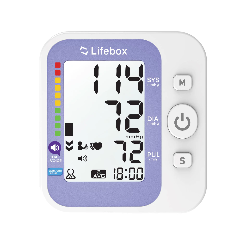 เครื่องวัดความดันโลหิต Lifebox รุ่น L-BM03 TH เป็นอุปกรณ์ที่ออกแบบมาเพื่อให้การวัดความดันโลหิตที่บ้านเป็นเรื่องง่ายและแม่นยำ โดยใช้ระบบดิจิตอลที่ให้ผลลัพธ์รวดเร็วและชัดเจนบนหน้าจอขนาดใหญ่ เครื่องรุ่นนี้มาพร้อมกับฟังก์ชันการวัดค่าความดันโลหิตทั้ง systolic, diastolic และอัตราการเต้นของหัวใจอย่างแม่นยำ การใช้งานง่ายด้วยปุ่มกดเดียว และสามารถแสดงผลค่าต่างๆ อย่างชัดเจน พร้อมทั้งมีฟังก์ชันการบันทึกข้อมูลการวัดหลายครั้ง ช่วยให้ผู้ใช้สามารถติดตามการเปลี่ยนแปลงของความดันโลหิตได้อย่างสะดวก