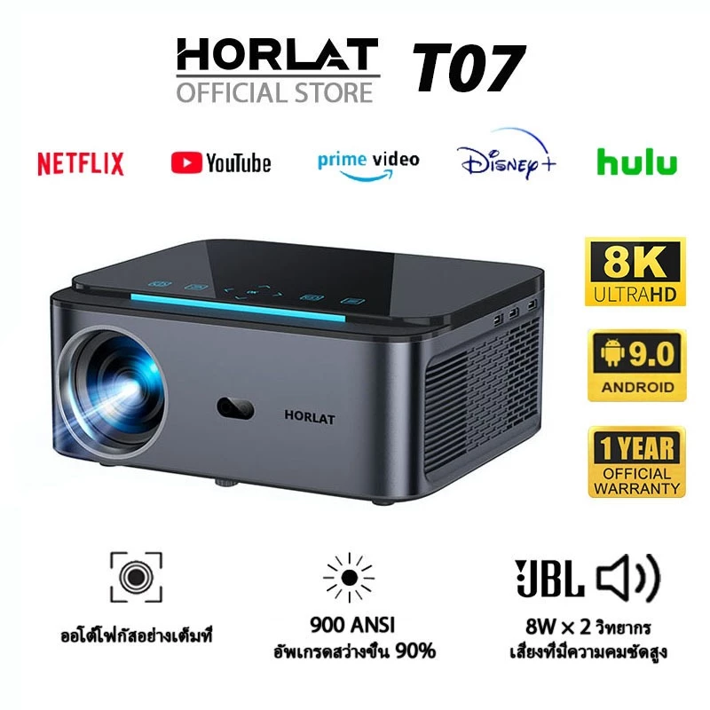 10. Horlat T07 8K UHD mini projector Android 9.0 JBL high fidelity sound โฟกัสอัตโนมัติ