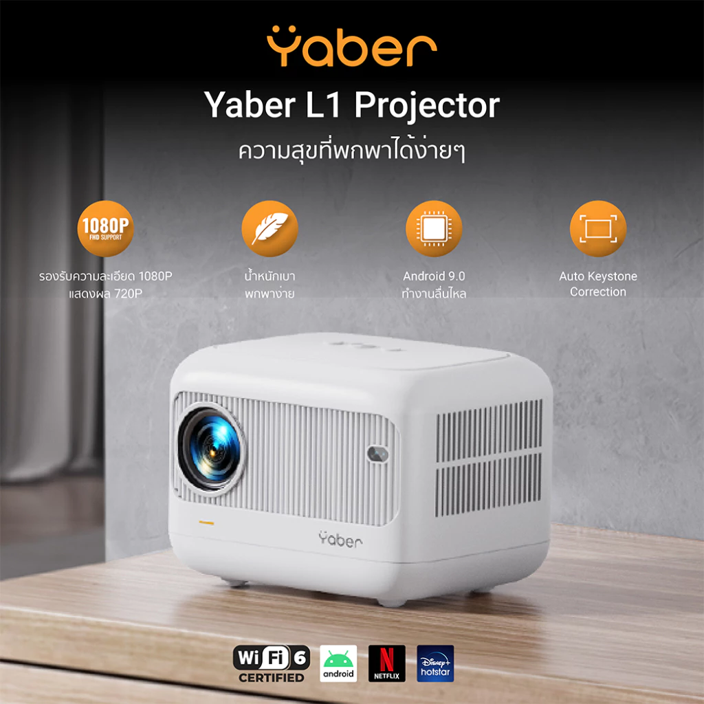 - Yaber L1 โปรเจคเตอร์ Android 9.0 คมชัด 720P FHD รองรับภาพ 1080P