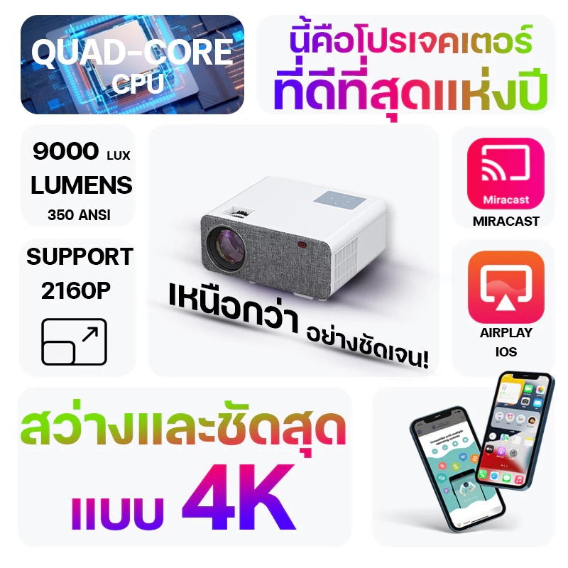 สตรีมภาพและเสียงจากอุปกรณ์ IOS หรือ Android ของคุณไปยังโปรเจคเตอร์โดยใช้ Apple IOS Aircast, Miracast สำหรับ Android หรือเชื่อมต่อโดยตรงผ่าน Wi-Fi ทำให้เพลิดเพลินกับภาพยนตร์ สไลด์ภาพ และเกมอย่างเต็มที่จากอุปกรณ์มือถือของคุณด้วยภาพที่ใหญ่ขึ้นและคมชัด สามารถรับชมได้อย่างน่าทึ่งด้วยขนาดภาพสูงสุด 120 นิ้ว ความละเอียดคมชัด 1920 x 1080p และความสว่างของภาพมากกว่า 5500 ลักซ์เพื่อให้ภาพที่สดใสคมชัดสูง