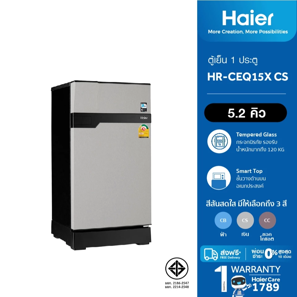 Haier ตู้เย็น 1 ประตู Muse series ขนาด 5.2 คิว รุ่น HR-CEQ15X มีระบบกระจายความเย็นแบบไดเร็คคูล ละลายน้ำแข็งกึ่งอัตโนมัติ ใช้งานง่ายเพียงกดปุ่มเดียว และหากใครกังวลว่าตู้เย็นนี้จะกินไฟหรือทำให้ค่าไฟฟ้าเพิ่มขึ้น ก็หมดกังวลได้ เพราะผู้ผลิตได้ออกแบบโดยคำนึงถึงเรื่องของการประหยัดพลังงานไว้ด้วย โดยได้บุฉนวนกันความร้อนให้หนาขึ้น และตู้เย็นนี้ได้รับฉลากประหยัดไฟเบอร์ 5 การันตีได้ว่า ไม่กินไฟมากอย่างแน่นอน