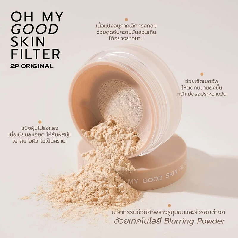 2P Original Oh My Good Skin Filter Translucent Powder แป้งฝุ่นโปร่งแสงเนื้อเนียนละเอียด ให้สัมผัสนุ่มเบาสบายผิว ช่วยควบคุมความมันและดูดซับความมันส่วนเกินได้อย่างยาวนาน อีกทั้งมีนวัตกรรมช่วยอำพรางรูขุมขนและริ้วรอยต่างๆ ด้วยเทคโนโลยี Blurring Powder ไม่ก่อให้เกิดคราบบนใบหน้าและช่วยเซ็ตเครื่องสำอางค์ให้ติดทนยาวนานยิ่งขึ้น ใช้แล้วผิวผ่องสวยอย่างเป็นธรรมชาติ สามารถใช้ได้ทุกโทนผิว